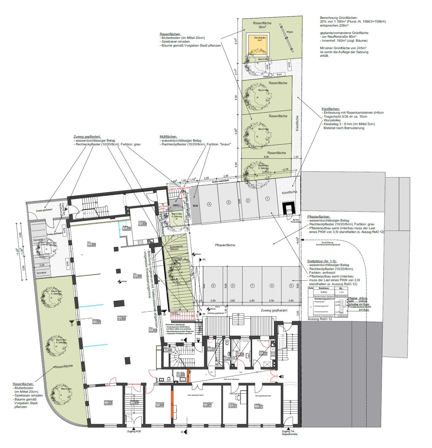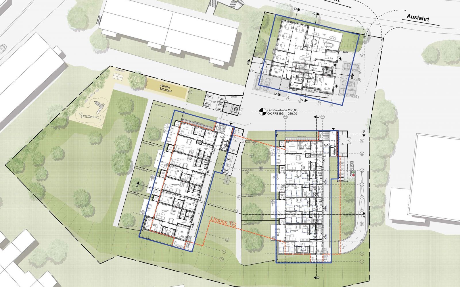 Neubau von zwei Mehrfamilienhäusern mit 44 Wohneinheiten und Tiefgarage sowie eines Wohn- und Geschäftsgebäudes mit 20 Apartments und 4 Gewerbeeinheiten